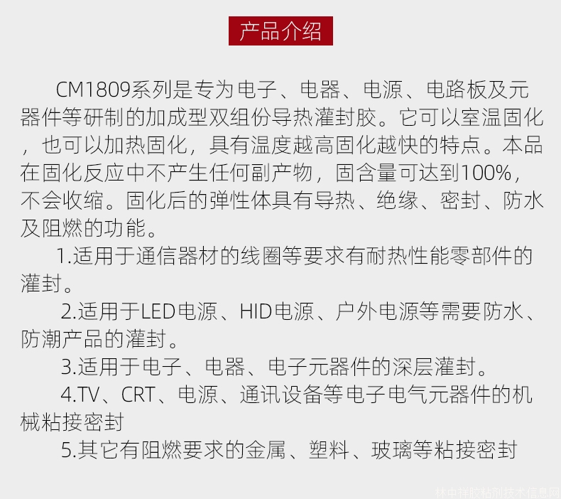 2.適用于LED電源、HID電源、戶(hù)外電源等需要防水、防潮產(chǎn)品的灌封。