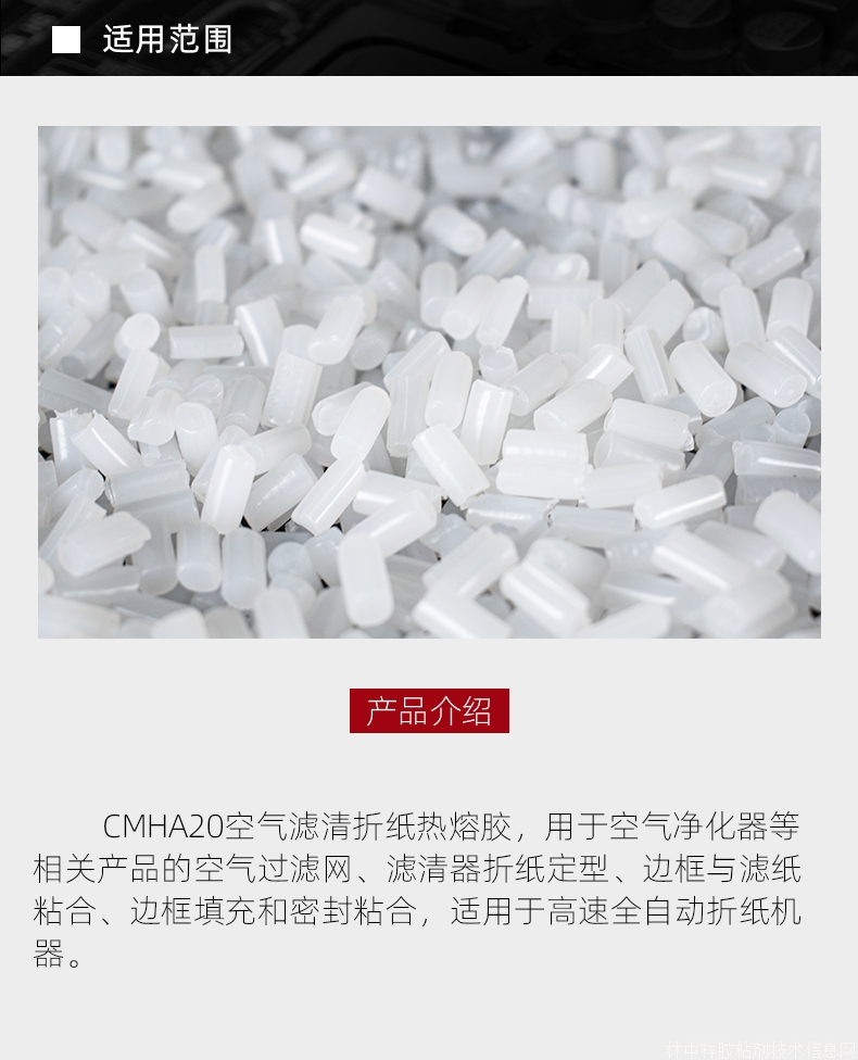 CMHA20空氣濾清折紙熱熔膠,用于空氣凈化器等相關(guān)產(chǎn)品的空氣過濾網(wǎng)、濾清器折紙定型、邊框與濾紙粘合﹑邊框填充和密封粘合,適用于高速全自動(dòng)折紙機(jī)器。