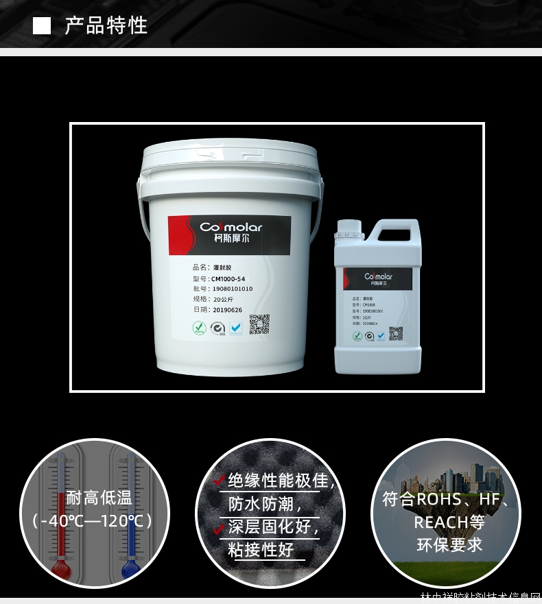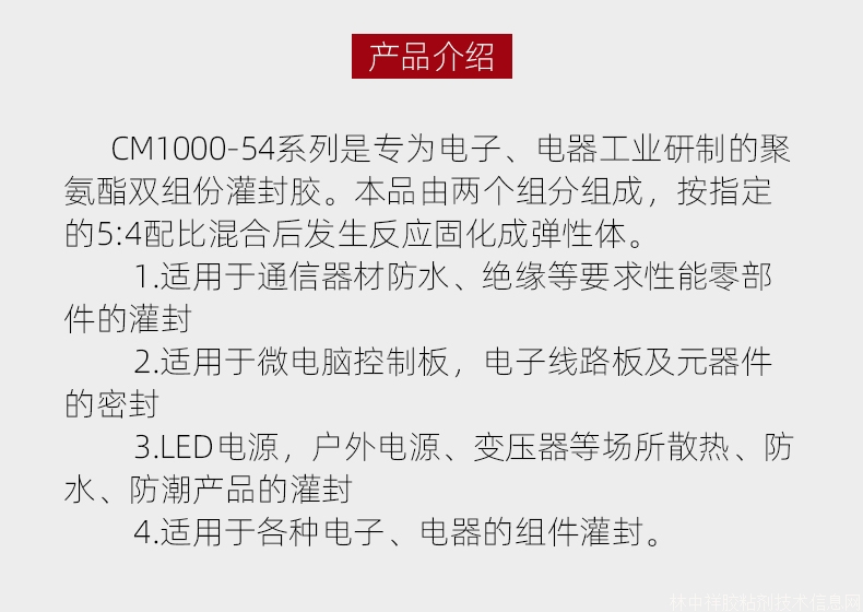 CM1000-54系列是專為電子、電器工業研制的聚氨酯雙組份灌封膠。本品由兩個組分組成,按指定的5:4配比混合后發生反應固化成彈性體。