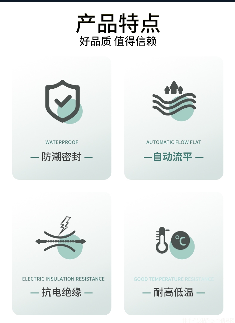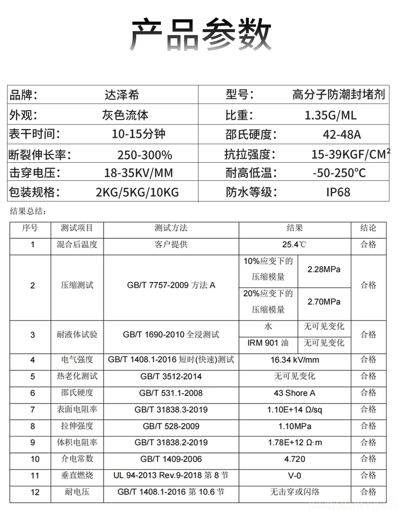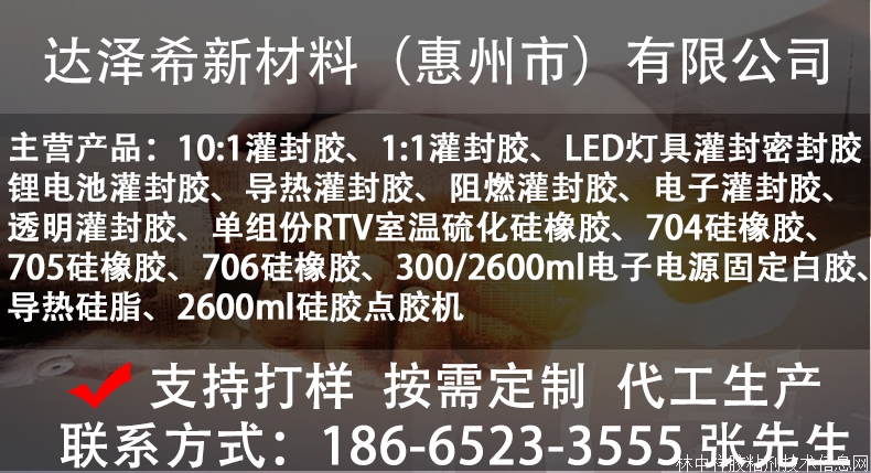 達澤希新材料(惠州市)有限公司是電子灌封膠、密封膠、硅橡膠、環氧樹脂灌封膠、聚氨脂灌封膠、LED封裝膠、硅油等產品專業生產加工的公司,聘請國內外,有機硅研究院士,博士,10多人專業從事有機硅材料研發工作,擁有完整、科學的質量管理體系。