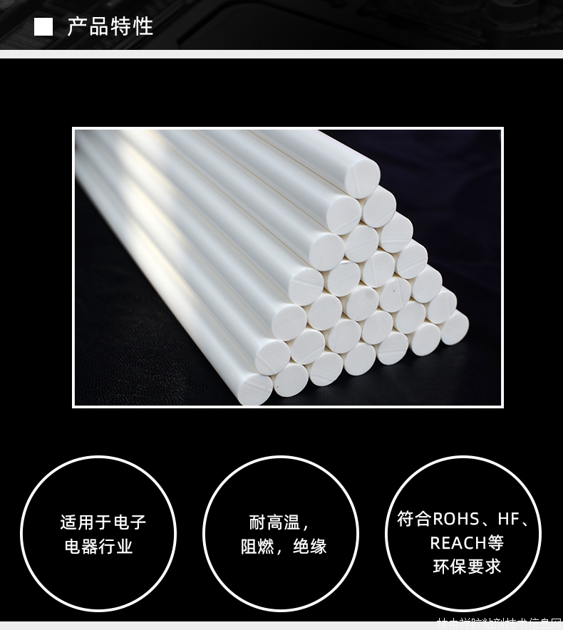 電子電器耐高溫熱熔膠棒,有較好耐溫性、絕緣性和抗電壓性,適用于電子電器、電子元器件,汽車內飾件,電源供應器,計算機主板,音響,電視機,顯示器,集成電路,變壓器,電子零部件如基板、電容、電磁線圈、電線、線圈及銅、鐵、鋁質配件之粘接固定。對于ABS、PVC、PET等塑料物品,金屬,玻璃,橡膠,木材等材質都有優異的粘接性。