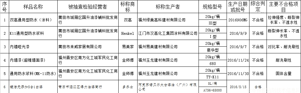 2016年流通領(lǐng)域涂料商品質(zhì)量抽查檢驗不合格名單