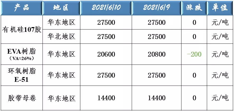 有機硅107、EVA樹脂、環(huán)氧樹脂和膠帶母卷原料價格走勢