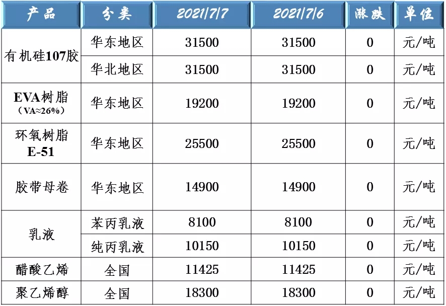 有機硅107、EVA樹脂、環(huán)氧樹脂、膠帶母卷、醋酸乙烯、聚乙烯醇和乳液原料價格走勢