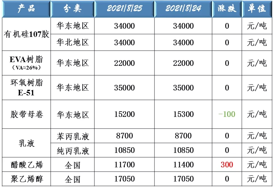 有機(jī)硅107、EVA樹脂、環(huán)氧樹脂、膠帶母卷、醋酸乙烯、聚乙烯醇和乳液原料價(jià)格走勢(shì)