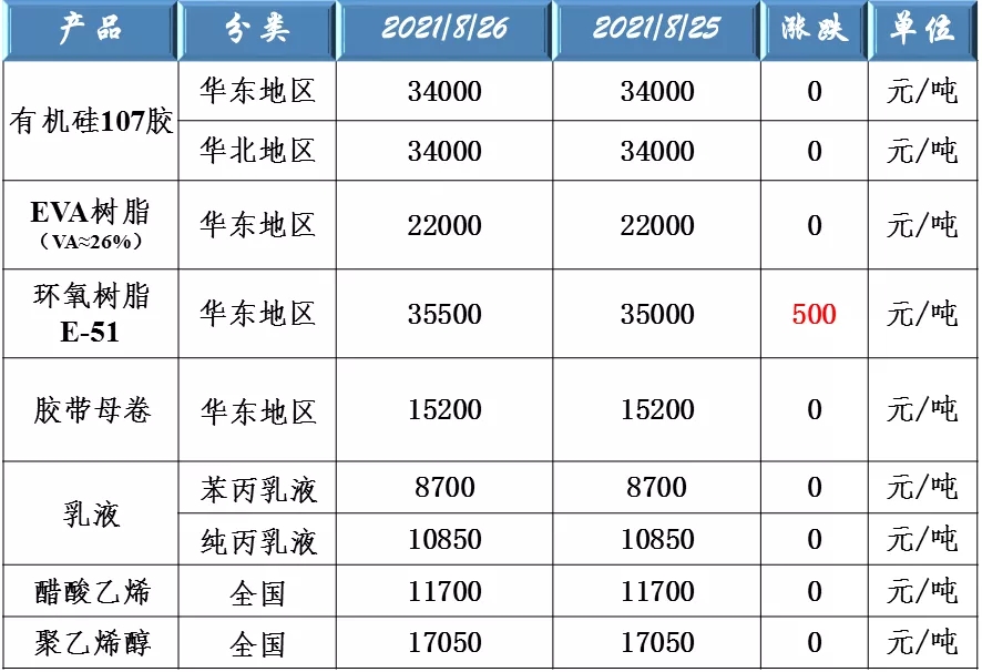有機硅107、EVA樹脂、環氧樹脂、膠帶母卷、醋酸乙烯、聚乙烯醇和乳液原料價格走勢