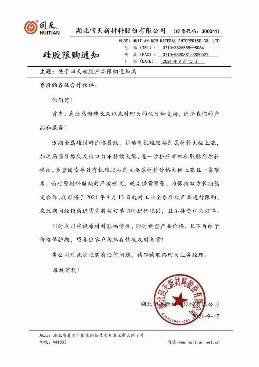 9月15日,湖北回天新材料股份有限公司(簡稱回天新材)發布硅膠限購通知!其表示:近期多重因素導致有機硅膠粘劑主要原材料大幅上漲且一貨難求,面對原材料短缺的嚴峻形式,成品供貨緊張,為保持雙方長期穩定合作,公司將于2021年9月15日起對工業全系硅膠產品進行限購,在此期間經銷商進貨量將按訂單70%進行限供,且不接受口頭訂單。同時回天將視原材料漲幅情況,即時調整產品價格,且不再給予價格保護期,望各位客戶視庫存情況及時備貨!