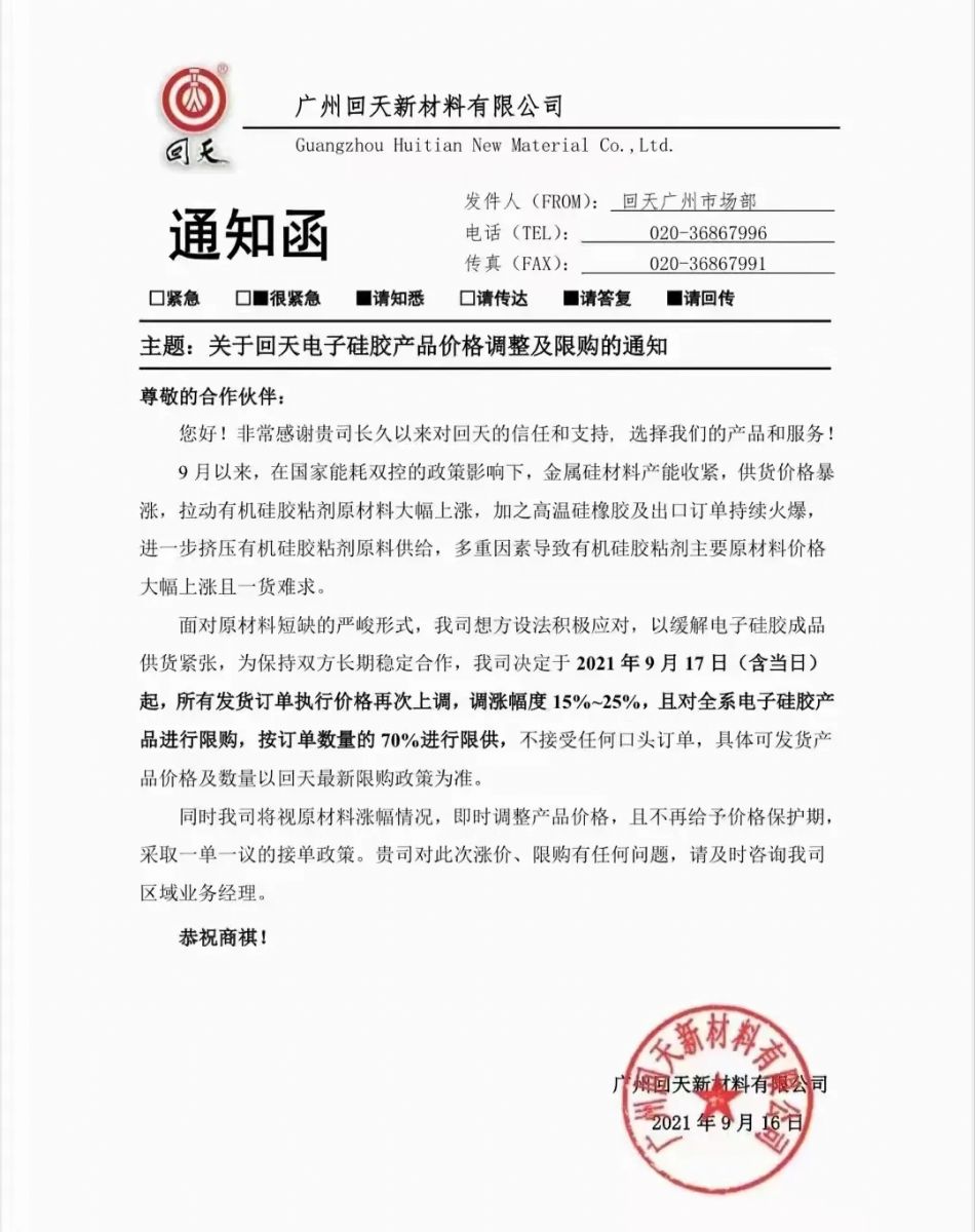 9月16日,回天新材全資子公司廣州回天亦對外發布電子硅膠產品價格調及限購的通知函!于2021年9月17日(含當日)起,所有發貨訂單執行價格再次上調,調漲幅度15%~25%,且對全系電子硅膠產品進行限購,按訂訂單數量的70%進行限供,不接受口頭訂單。同時回天將視原材料漲幅情況,即時調整產品價格,且不再給予價格保護期,采取一單一議的接單政策。