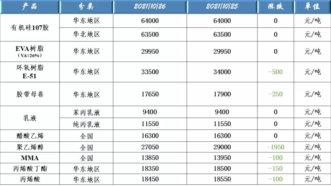 有機(jī)硅107、EVA樹脂、環(huán)氧樹脂、膠帶母卷、醋酸乙烯、聚乙烯醇和乳液原料價(jià)格走勢(shì)