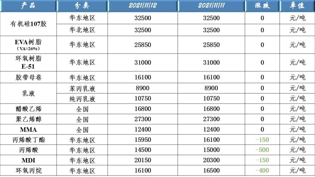 有機(jī)硅107、EVA樹脂、環(huán)氧樹脂、膠帶母卷、醋酸乙烯、聚乙烯醇、乳液、丙烯酸、MDI及環(huán)氧丙烷等原料價格走勢