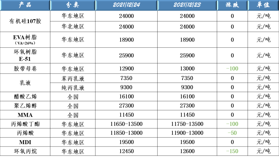 有機硅107、EVA樹脂、環(huán)氧樹脂、膠帶母卷、醋酸乙烯、聚乙烯醇和乳液原料價格走勢