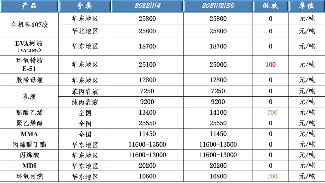有機(jī)硅107、EVA樹(shù)脂、環(huán)氧樹(shù)脂、膠帶母卷、醋酸乙烯、聚乙烯醇、乳液、丙烯酸、MDI及環(huán)氧丙烷等原料價(jià)格走勢(shì)