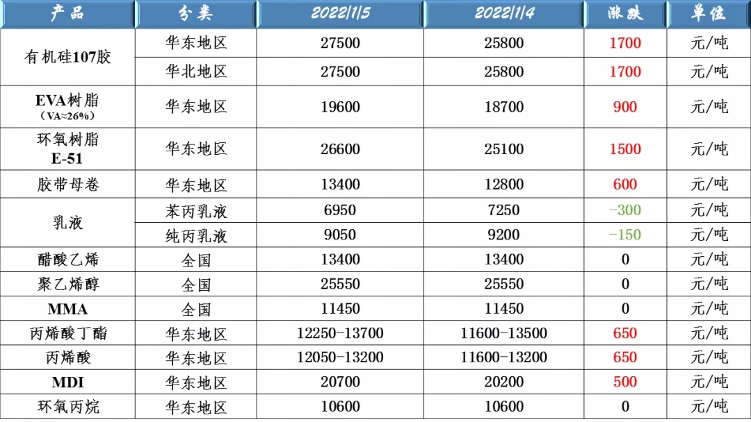 有機硅107、EVA樹脂、環氧樹脂、膠帶母卷、醋酸乙烯、聚乙烯醇、乳液、丙烯酸、MDI及環氧丙烷等原料價格走勢