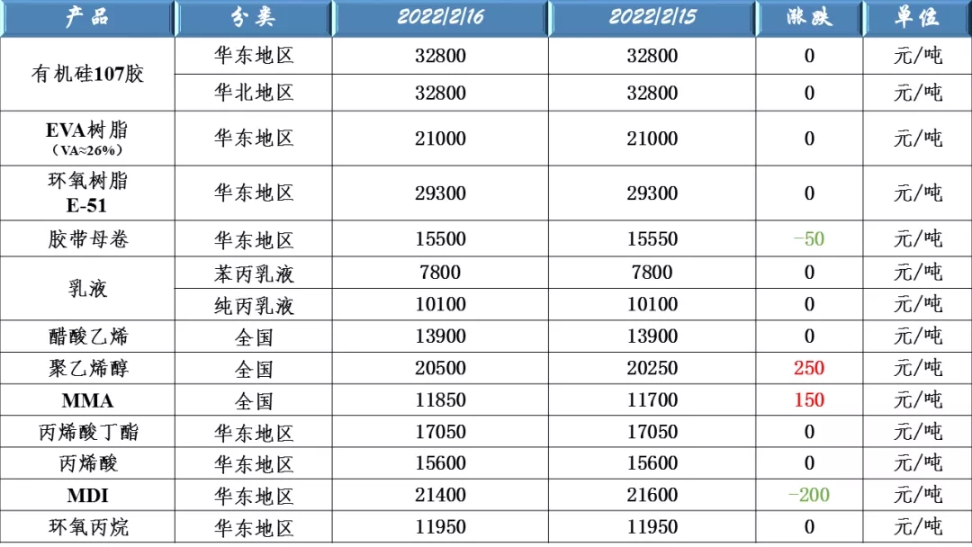 有機(jī)硅107、EVA樹(shù)脂、環(huán)氧樹(shù)脂、膠帶母卷、醋酸乙烯、聚乙烯醇、乳液、丙烯酸、MDI及環(huán)氧丙烷等原料價(jià)格走勢(shì)