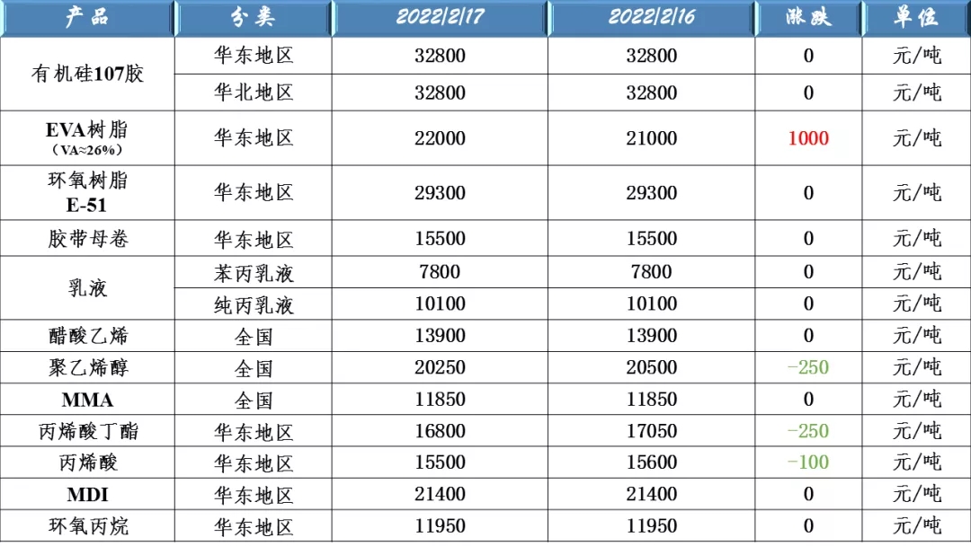 有機硅107、EVA樹脂、環(huán)氧樹脂、膠帶母卷、醋酸乙烯、聚乙烯醇、乳液、丙烯酸、MDI及環(huán)氧丙烷等原料價格走勢