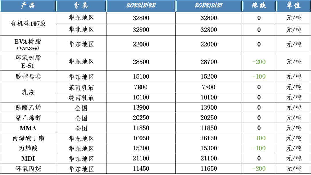 有機硅107、EVA樹脂、環(huán)氧樹脂、膠帶母卷、醋酸乙烯、聚乙烯醇、乳液、丙烯酸、MDI及環(huán)氧丙烷等價格走勢