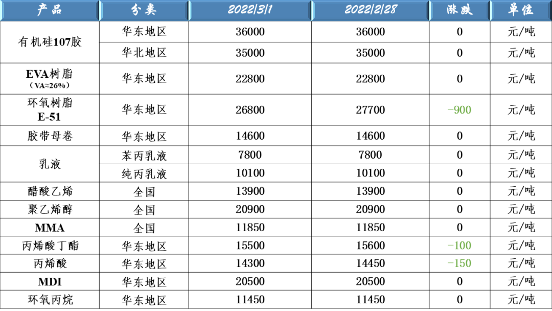 有機(jī)硅107、EVA樹脂、環(huán)氧樹脂、膠帶母卷、醋酸乙烯、聚乙烯醇、乳液、丙烯酸、MDI及環(huán)氧丙烷等價格走勢