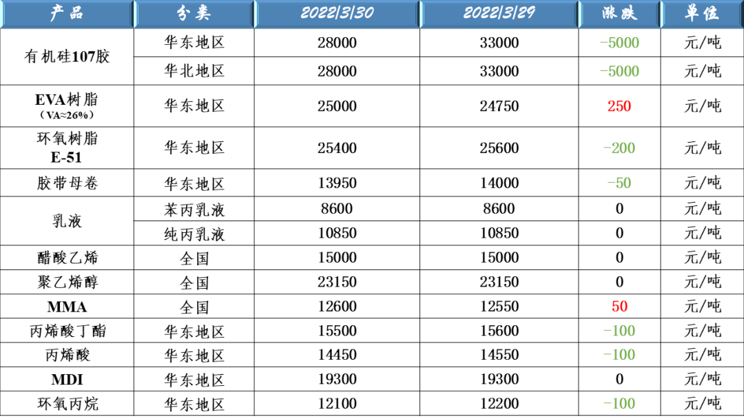 有機硅107、EVA樹脂、環(huán)氧樹脂、膠帶母卷、醋酸乙烯、聚乙烯醇、乳液、丙烯酸、MDI及環(huán)氧丙烷等原料價格走勢