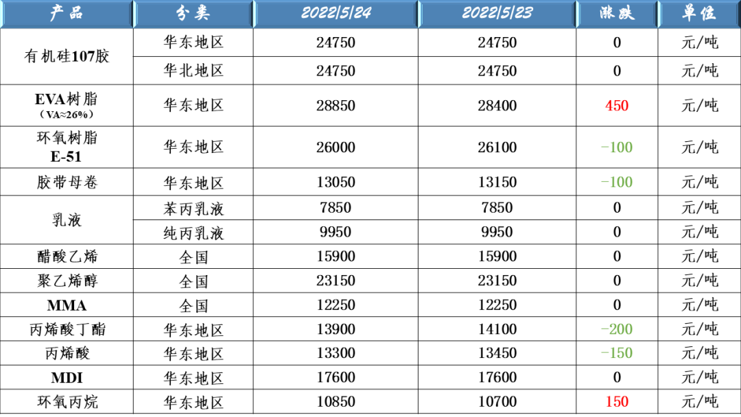 有機(jī)硅107、EVA樹(shù)脂、環(huán)氧樹(shù)脂、膠帶母卷、醋酸乙烯、聚乙烯醇、乳液、丙烯酸、MDI及環(huán)氧丙烷等原料價(jià)格走勢(shì)
