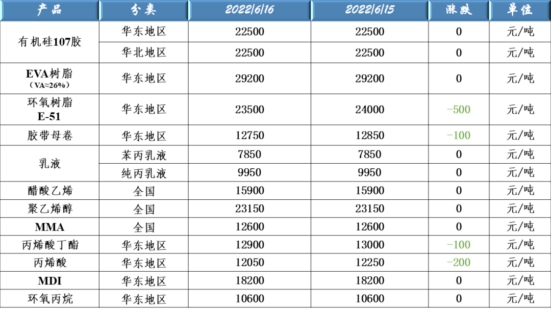 有機硅107、EVA樹脂、環氧樹脂、膠帶母卷、醋酸乙烯、聚乙烯醇、乳液、丙烯酸、MDI及環氧丙烷等原料價格走勢