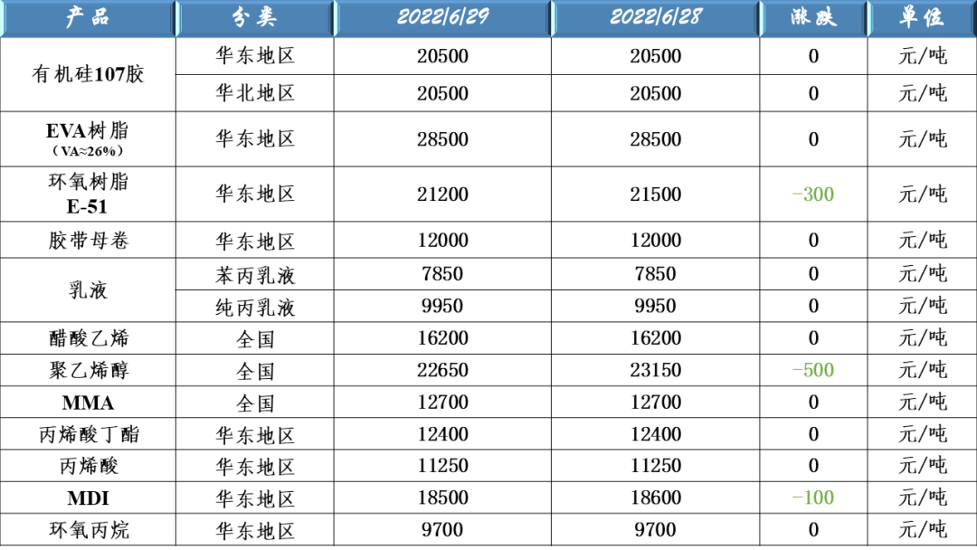 有機(jī)硅107、EVA樹脂、環(huán)氧樹脂、膠帶母卷、醋酸乙烯、聚乙烯醇、乳液、丙烯酸、MDI及環(huán)氧丙烷等原料價(jià)格走勢(shì)