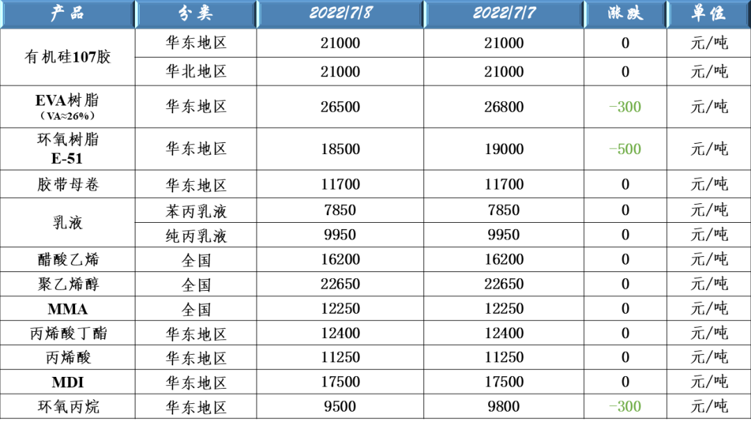 有機硅107、EVA樹脂、環(huán)氧樹脂、膠帶母卷、醋酸乙烯、聚乙烯醇、乳液、丙烯酸、MDI及環(huán)氧丙烷等價格走勢