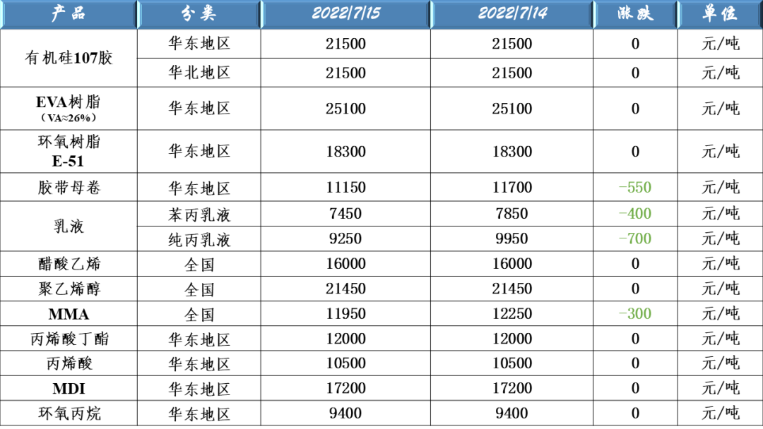 有機硅107、EVA樹脂、環(huán)氧樹脂、膠帶母卷、醋酸乙烯、聚乙烯醇、乳液、丙烯酸、MDI及環(huán)氧丙烷等原料價格走勢