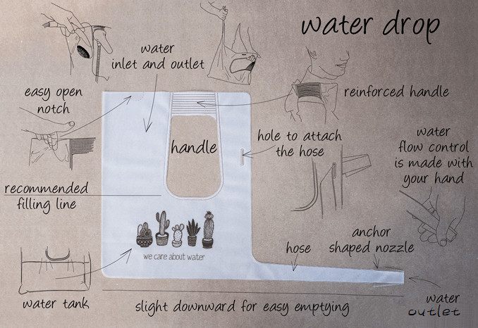 WaterDrop由可回收的熱塑性聚氨酯(TPU)材料打造,因此彈性和韌性超強(qiáng),不用擔(dān)心水放的過(guò)多而爆裂,稱得上就是一款褲兜里的水壺。它被打造成一個(gè)手提袋的形式,這樣水的收藏、儲(chǔ)存、攜帶就變得非常方便。人們可以用袋子里的水拿來(lái)澆花、沖廁所等,如下圖: